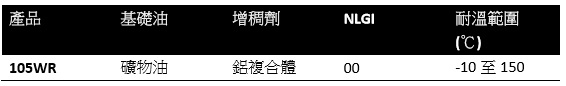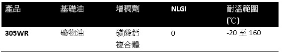 得必可305WR是以磺酸鈣稠化的軟性潤滑脂,抗磨損與受重負荷極佳。得必可305WR的防水與防腐蝕能力出眾,特別適合用於離岸設備或鹽水環境。該產品亦可作為密封劑,能有效隔離灰塵與污染物入侵,密封效果優異。